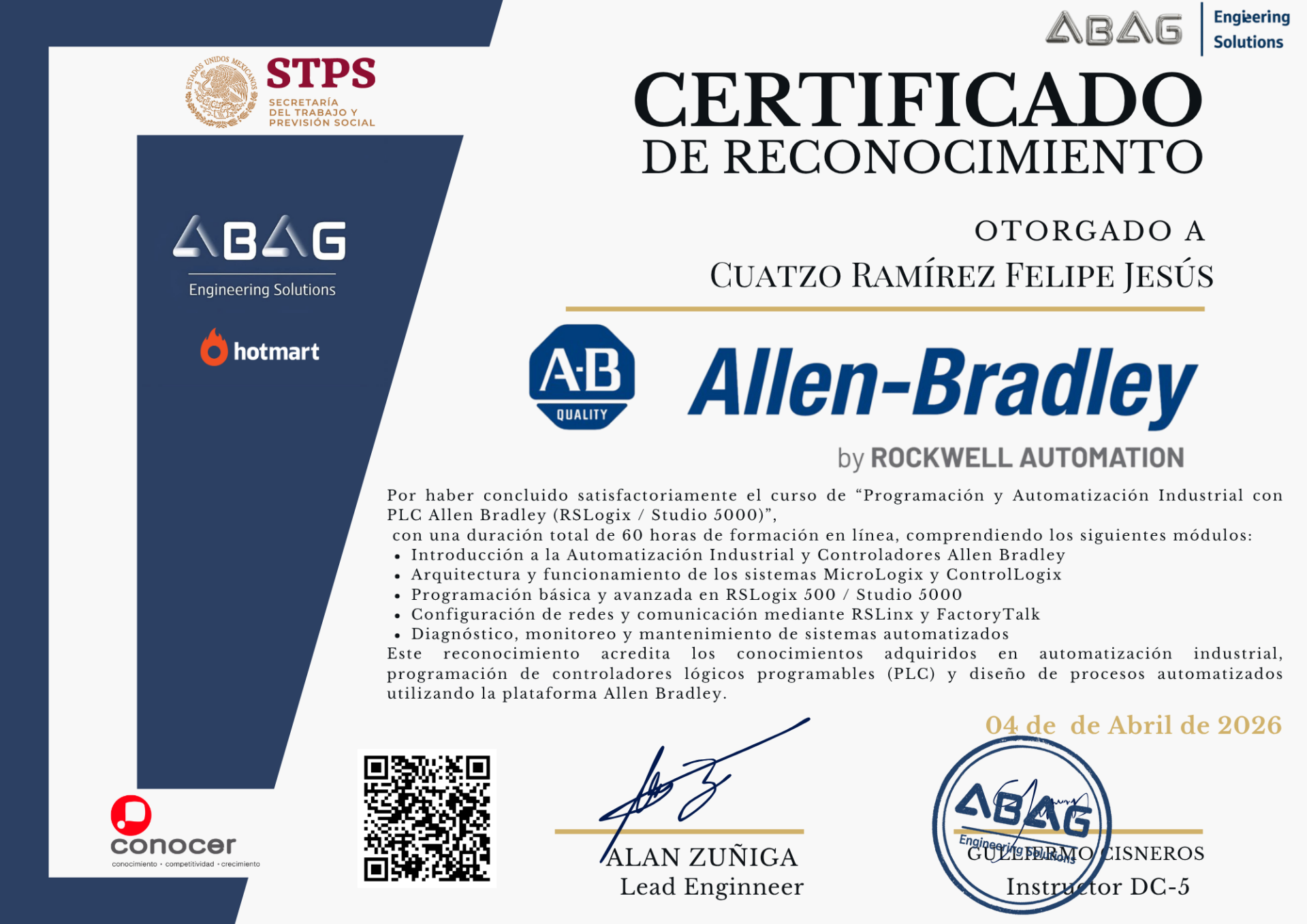Este reconocimiento acredita los conocimientos adquiridos en automatización industrial, programación de controladores lógicos programables (PLC) y diseño de procesos automatizados utilizando la plataforma Allen Bradley.