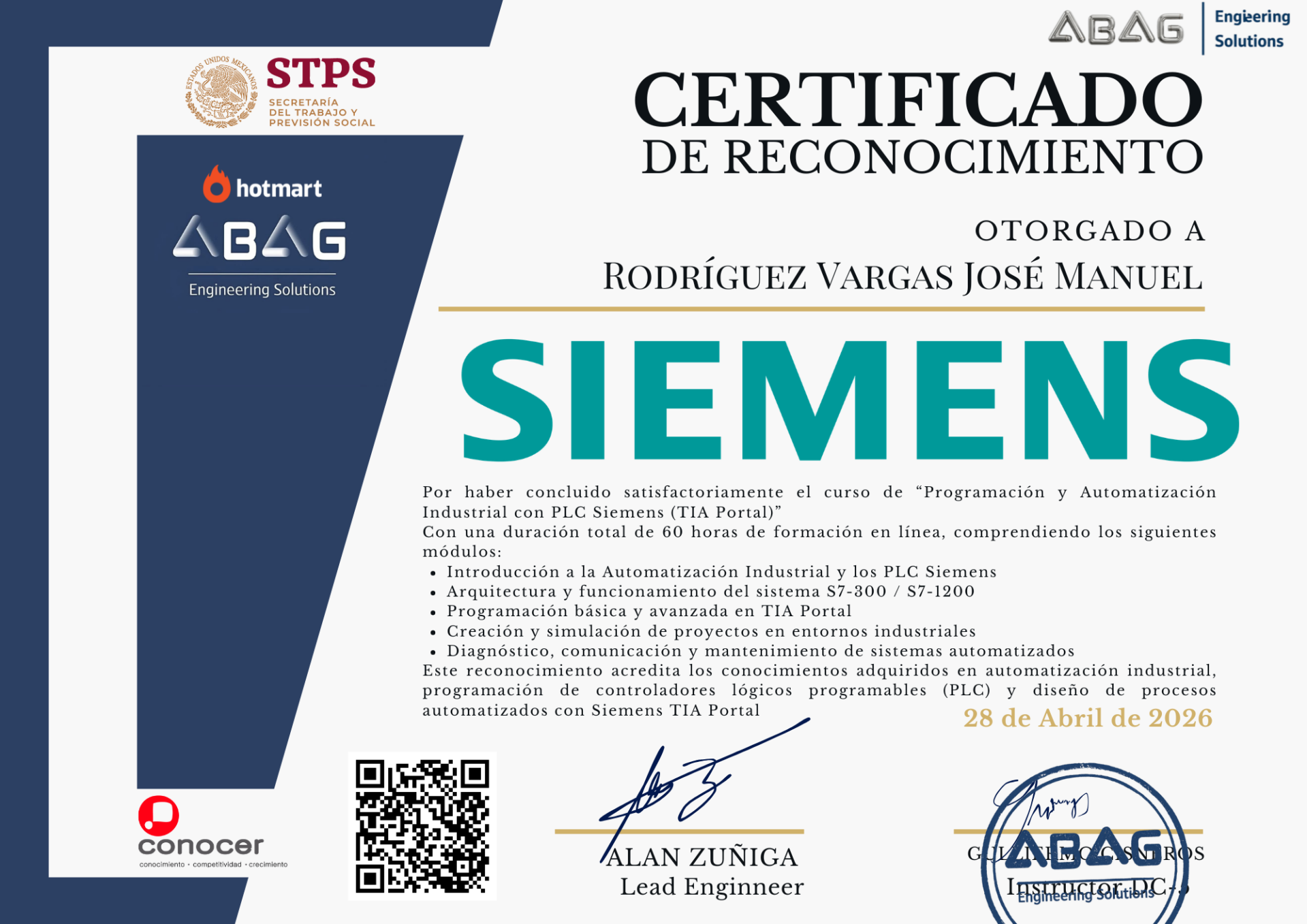 Este reconocimiento acredita los conocimientos adquiridos en automatización industrial, programación de controladores lógicos programables (PLC) y diseño de procesos automatizados con Siemens TIA Portal